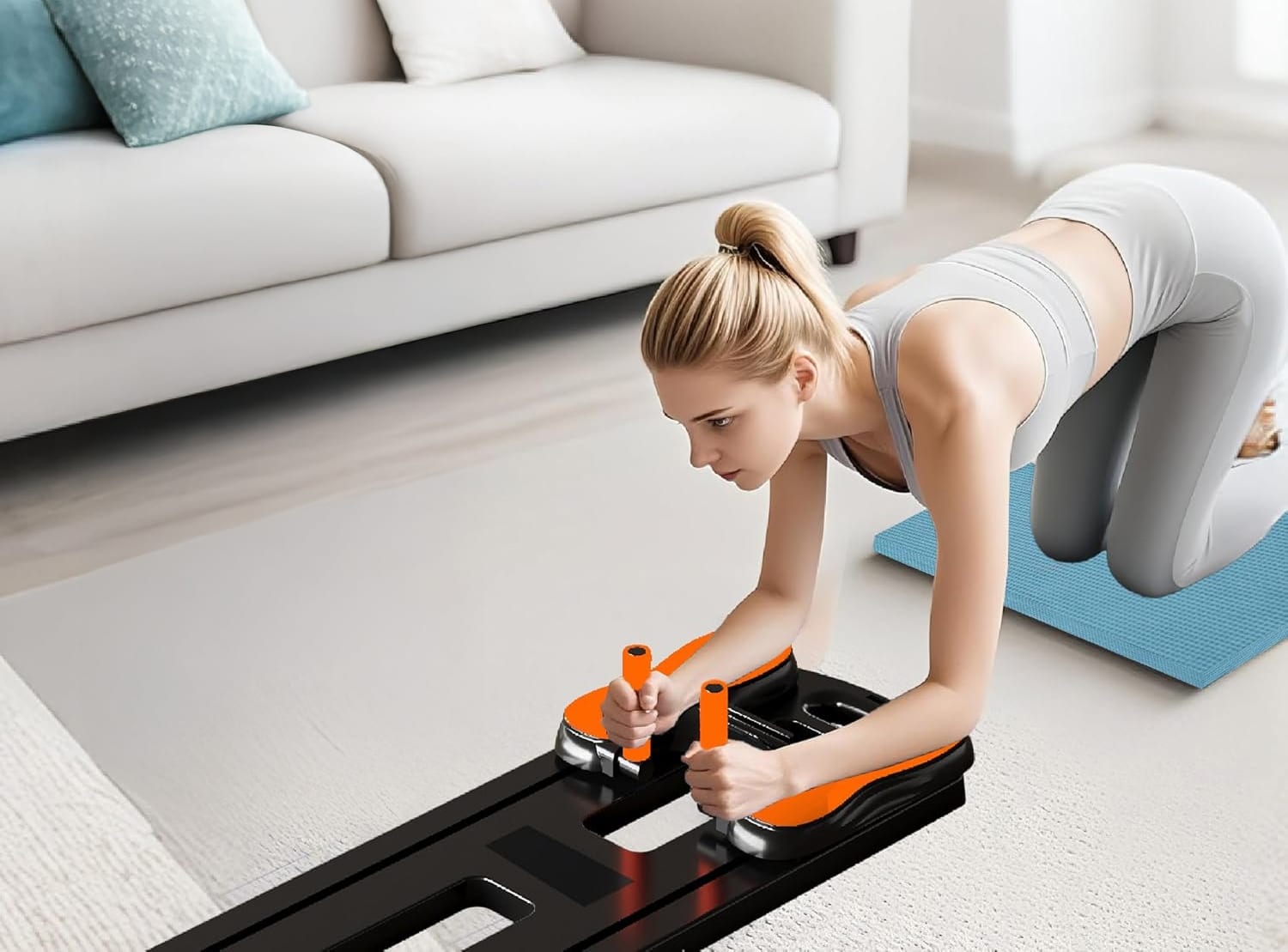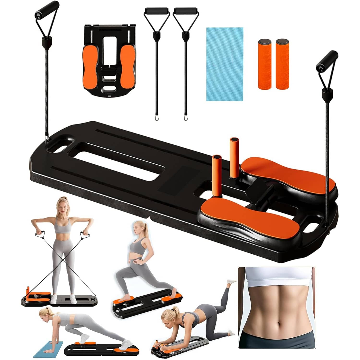 The quiet non-slip pads ensure you can exercise at any hour without disturbing family members or neighbors, while the ab crunch handles and specialized grip system provide multiple hand positioning options for exercise variety. The comprehensive accessory package includes everything needed to begin immediately: the main board unit, two resistance bands with handles, orange foam grips, a blue exercise mat, and additional grip handles for advanced movements.